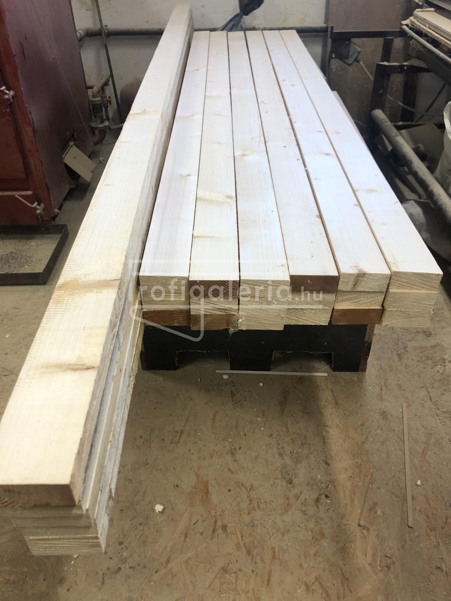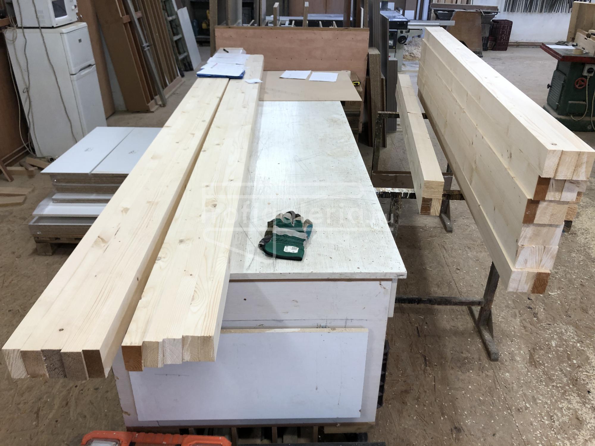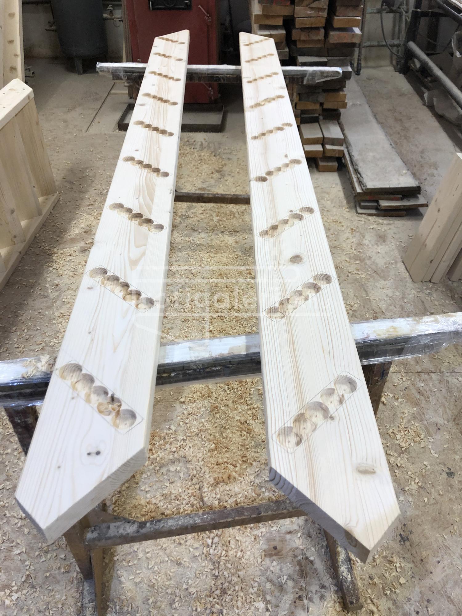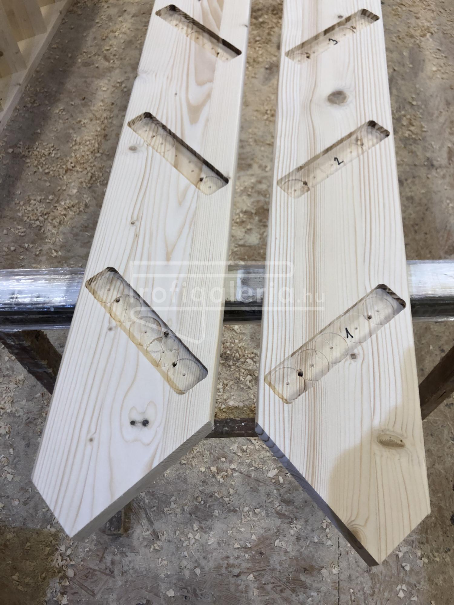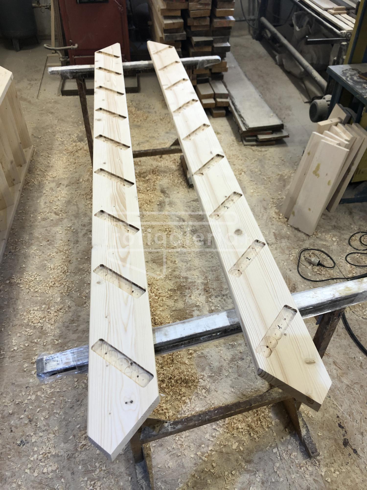 A galériákat saját magam készítem elő kiszállítás előtt. A fa sokkal stabilabb, ha több darabból van összeragasztva, ezért a legtöbb esetben ragasztott mestergerendát alkalmazok. Fesztávtól függően a kereszt gerendák is lehetnek ragasztottak. Ezeket a gerendákat vagy én ragasztom meg, vagy eleve ragasztott gerenda alapanyagból dolgozom. Akármelyik verzió mellett döntök, itt is a precizitást tartom az elsődleges szempontnak, ezért évekre előre fel van töltve a raktáram ragasztott és nem ragasztott áruval annak érdekében, hogy ne friss, hanem garantáltan száraz anyagból dolgozhassak. A ragasztásra váró fenyőáru felhasználás előtt 2-3 évet tölt egy nyáron 50-60 C°-os padláson, hogy garantáltan elveszítse a felhasználásig a faanyag a nem kívánt nedvességtartalmát, ezzel minimálisra csökkentem a vetemedés és a repedezés esélyét.