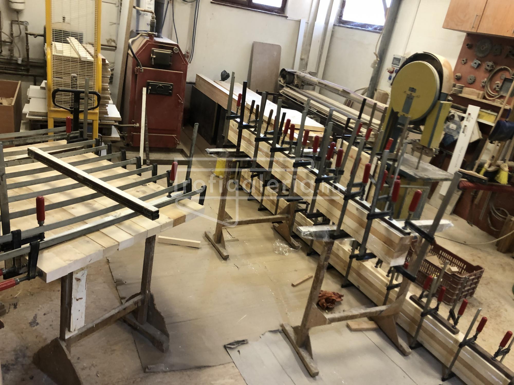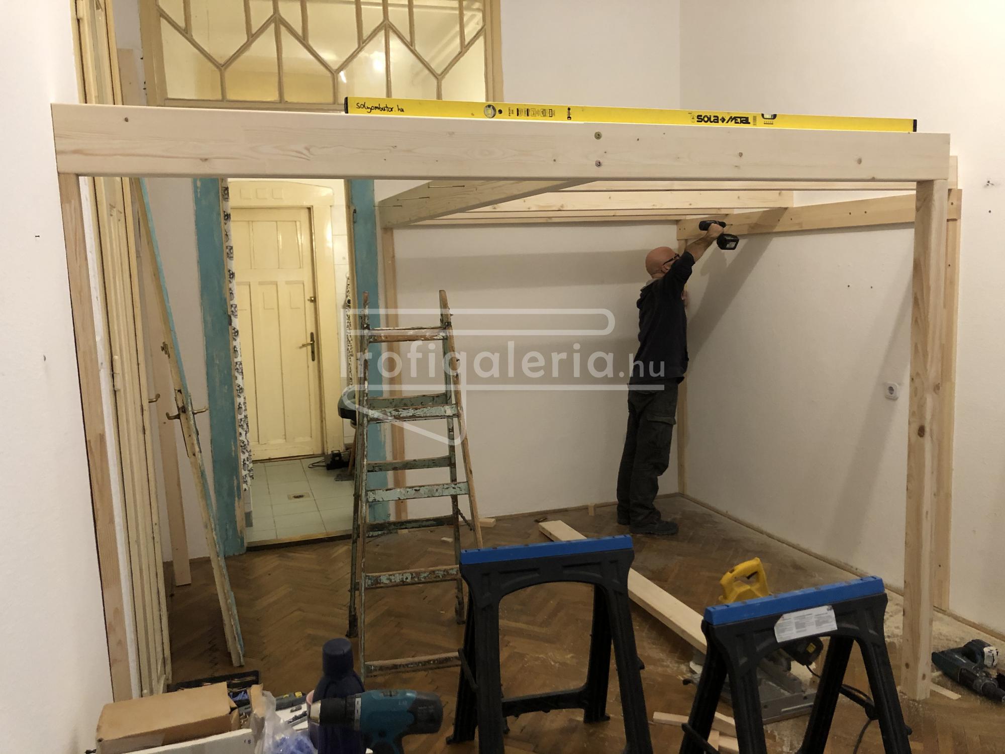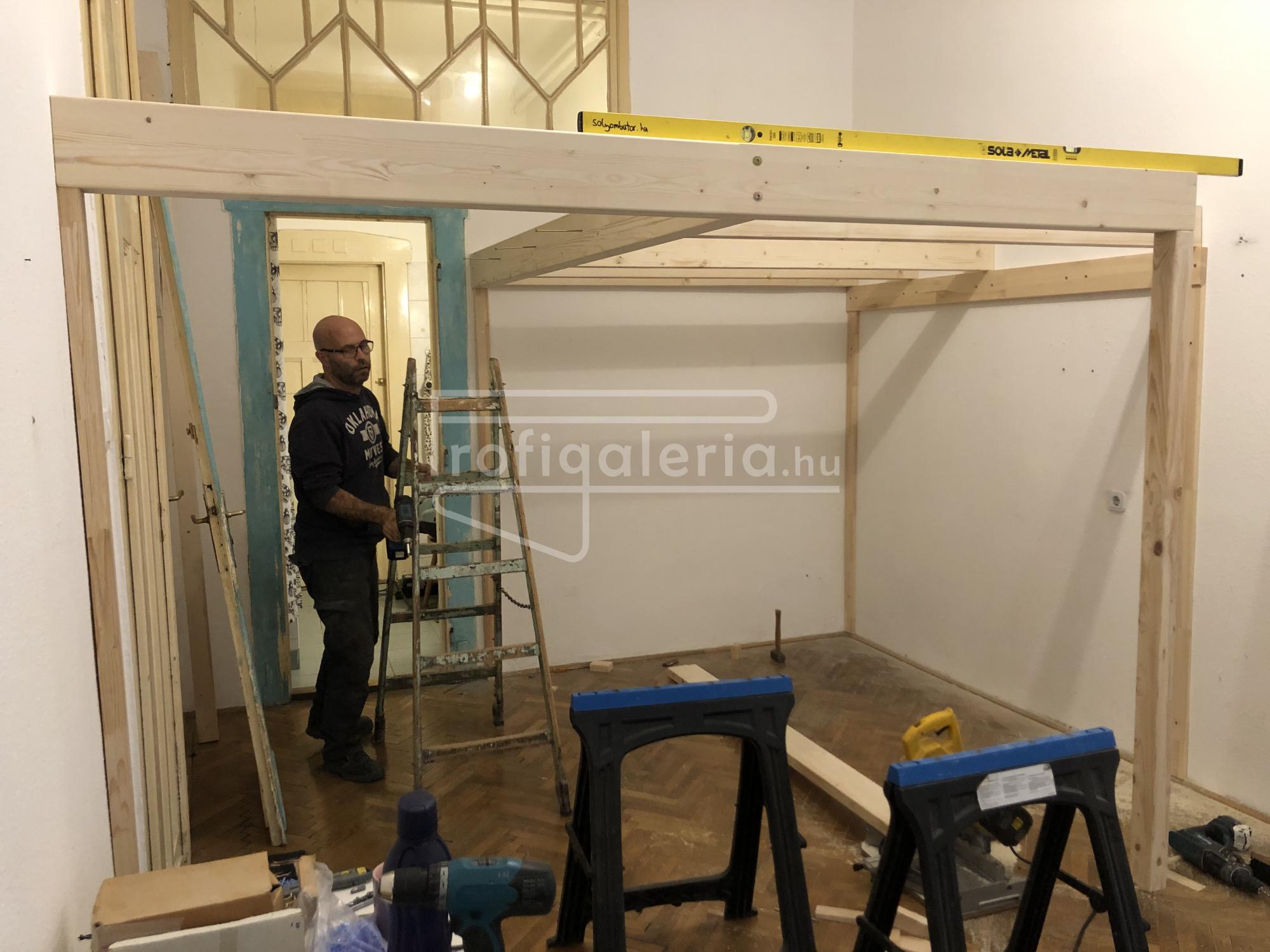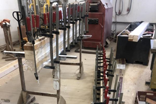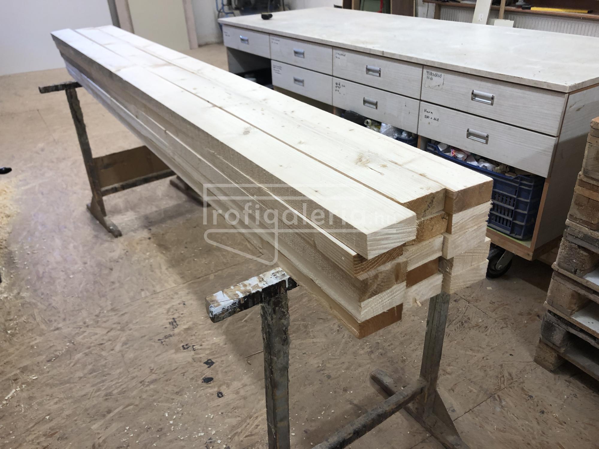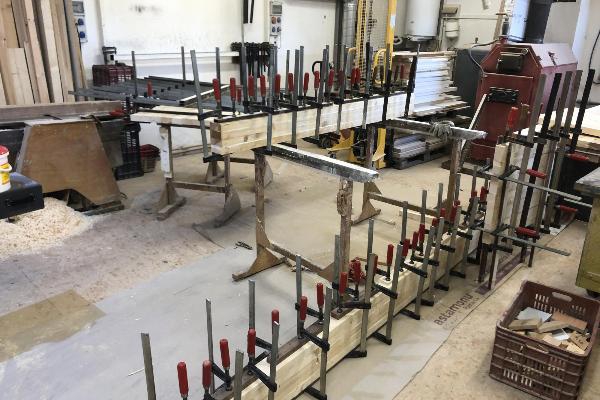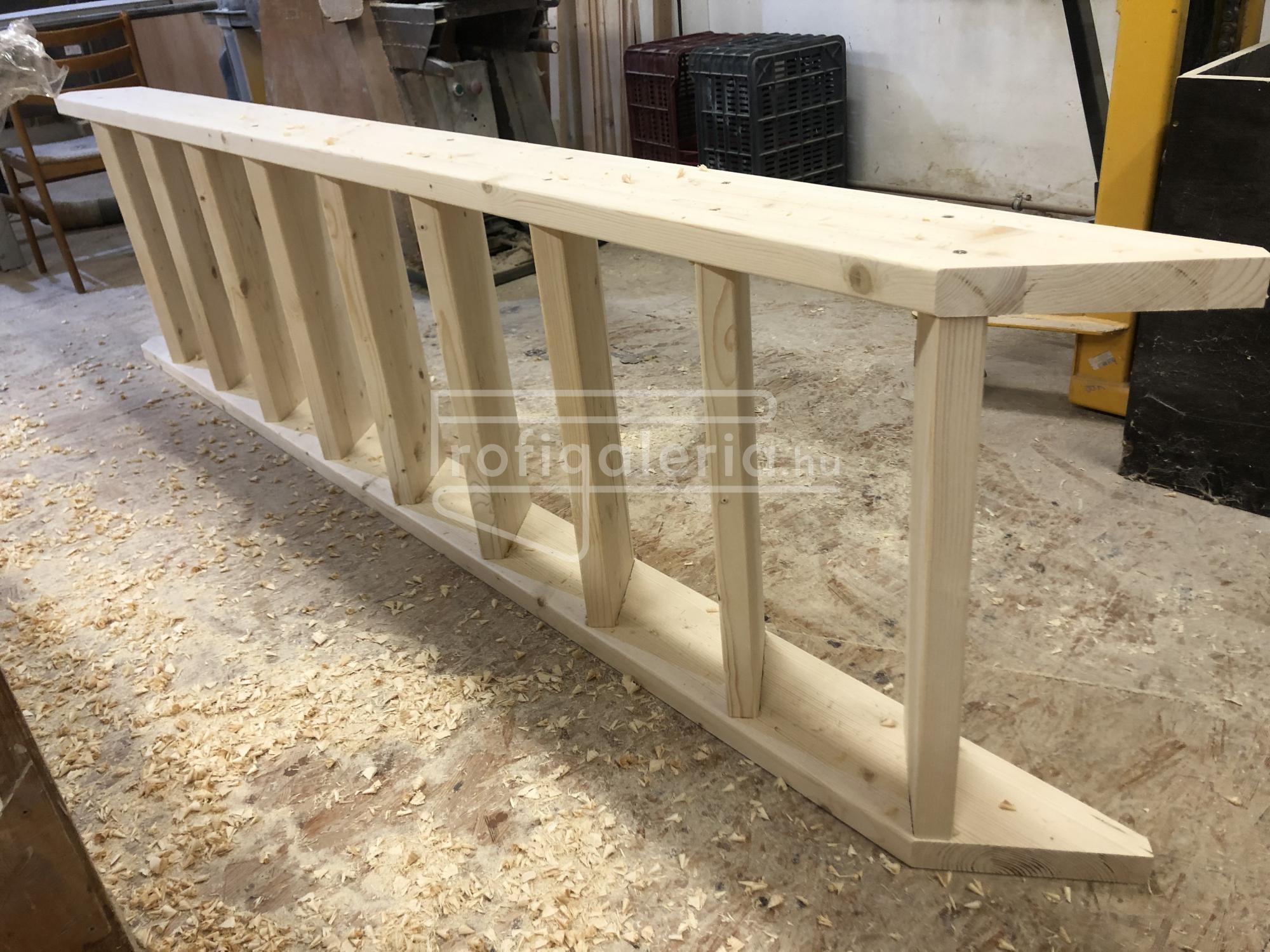 A galériákat saját magam készítem elő kiszállítás előtt. A fa sokkal stabilabb, ha több darabból van összeragasztva, ezért a legtöbb esetben ragasztott mestergerendát alkalmazok. Fesztávtól függően a kereszt gerendák is lehetnek ragasztottak. Ezeket a gerendákat vagy én ragasztom meg, vagy eleve ragasztott gerenda alapanyagból dolgozom. Akármelyik verzió mellett döntök, itt is a precizitást tartom az elsődleges szempontnak, ezért évekre előre fel van töltve a raktáram ragasztott és nem ragasztott áruval annak érdekében, hogy ne friss, hanem garantáltan száraz anyagból dolgozhassak. A ragasztásra váró fenyőáru felhasználás előtt 2-3 évet tölt egy nyáron 50-60 C°-os padláson, hogy garantáltan elveszítse a felhasználásig a faanyag a nem kívánt nedvességtartalmát, ezzel minimálisra csökkentem a vetemedés és a repedezés esélyét.