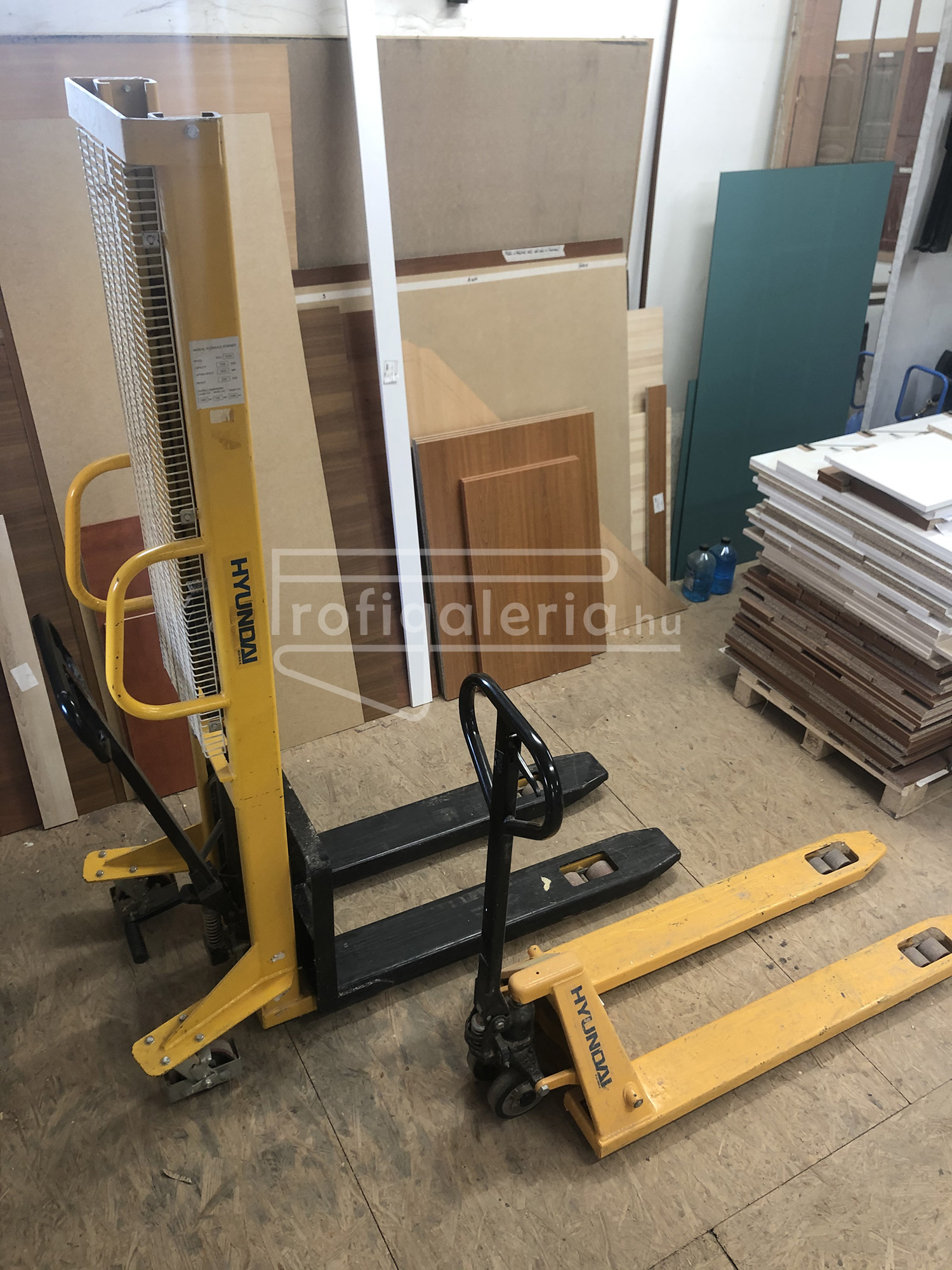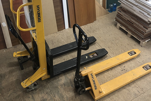 Raklapemelő és hidraulikus kézi magasemelő.