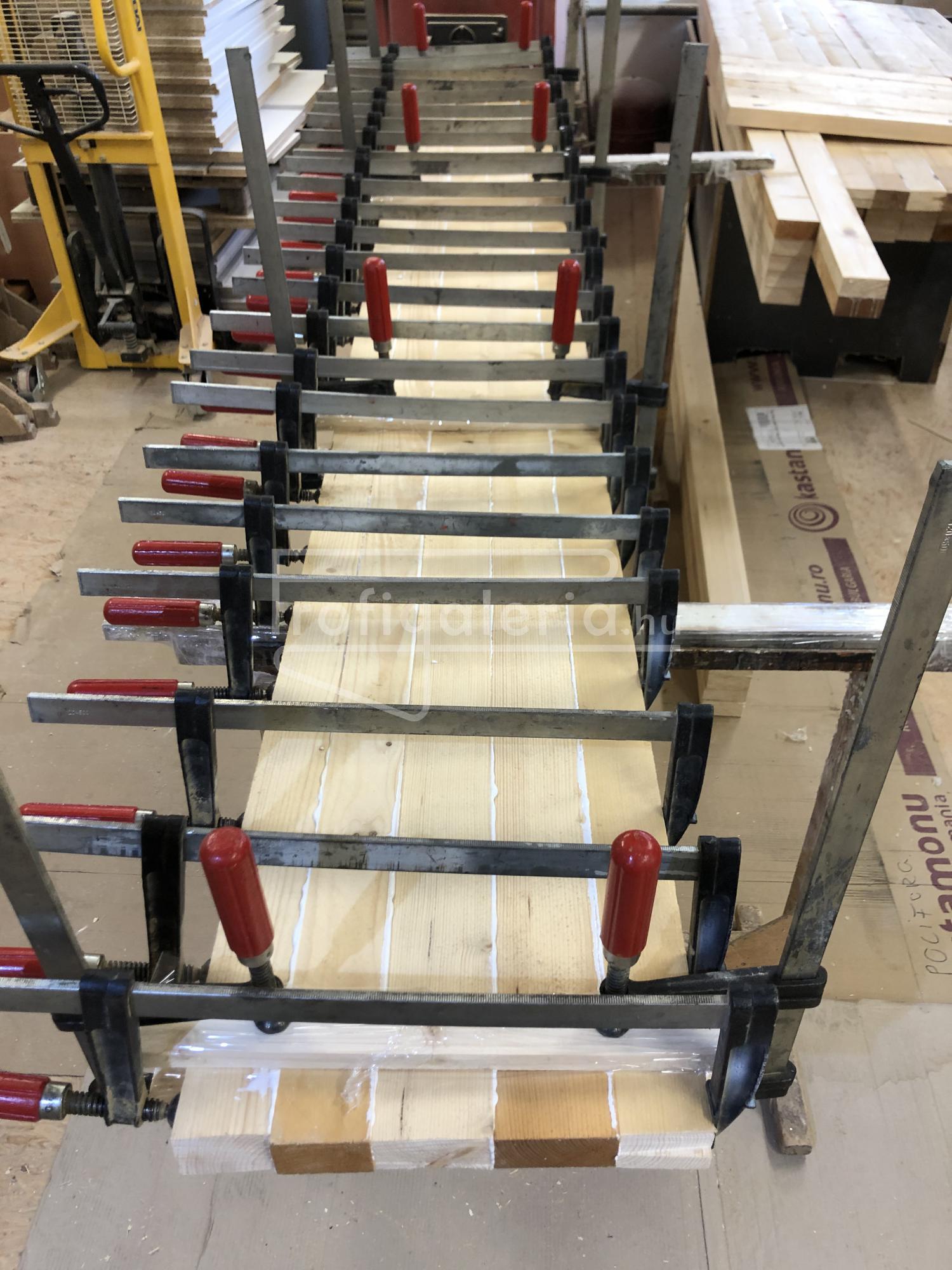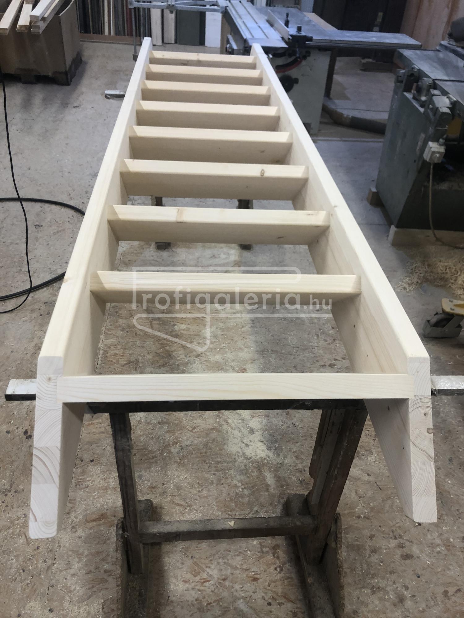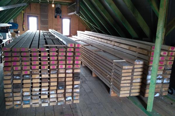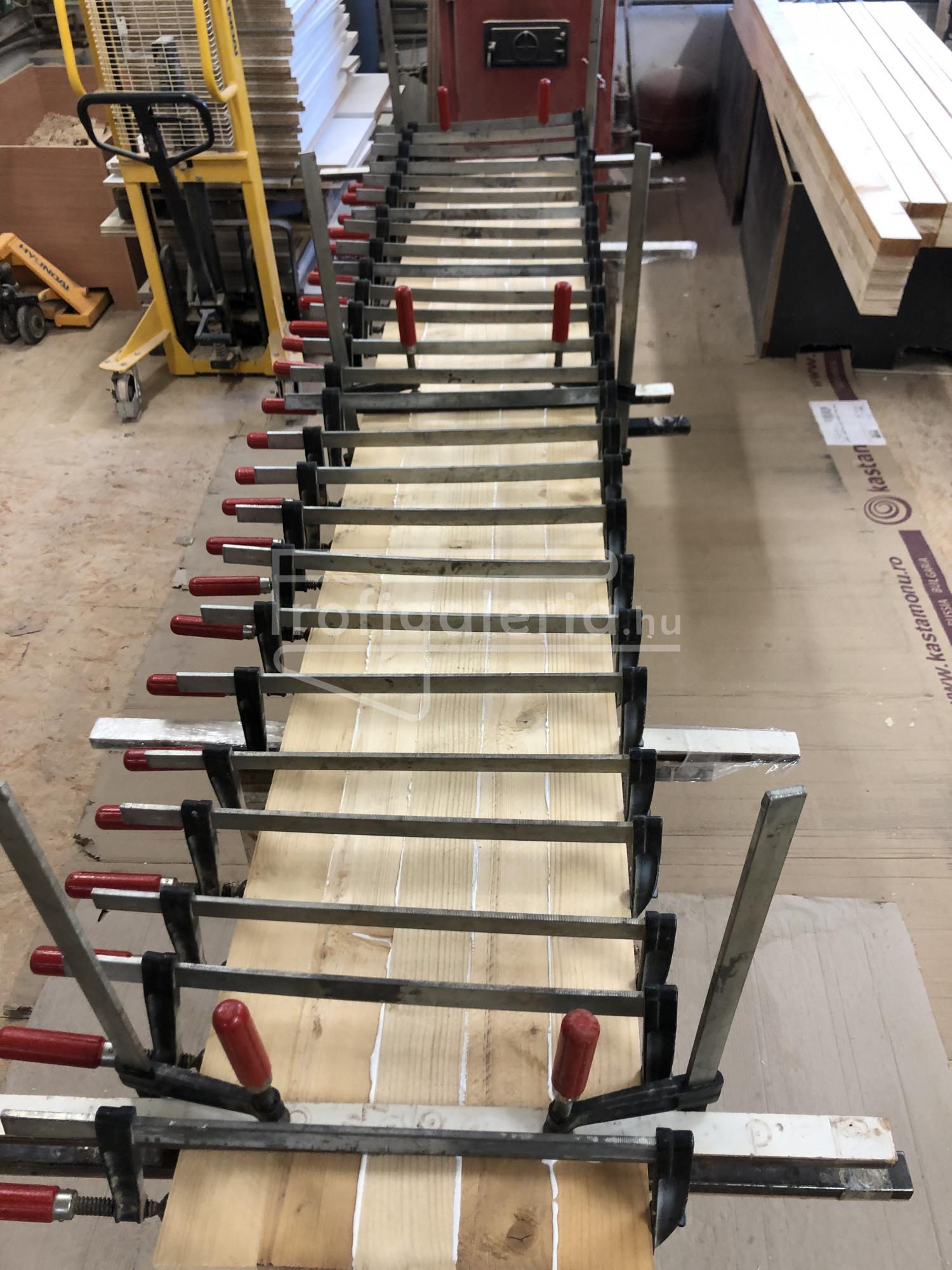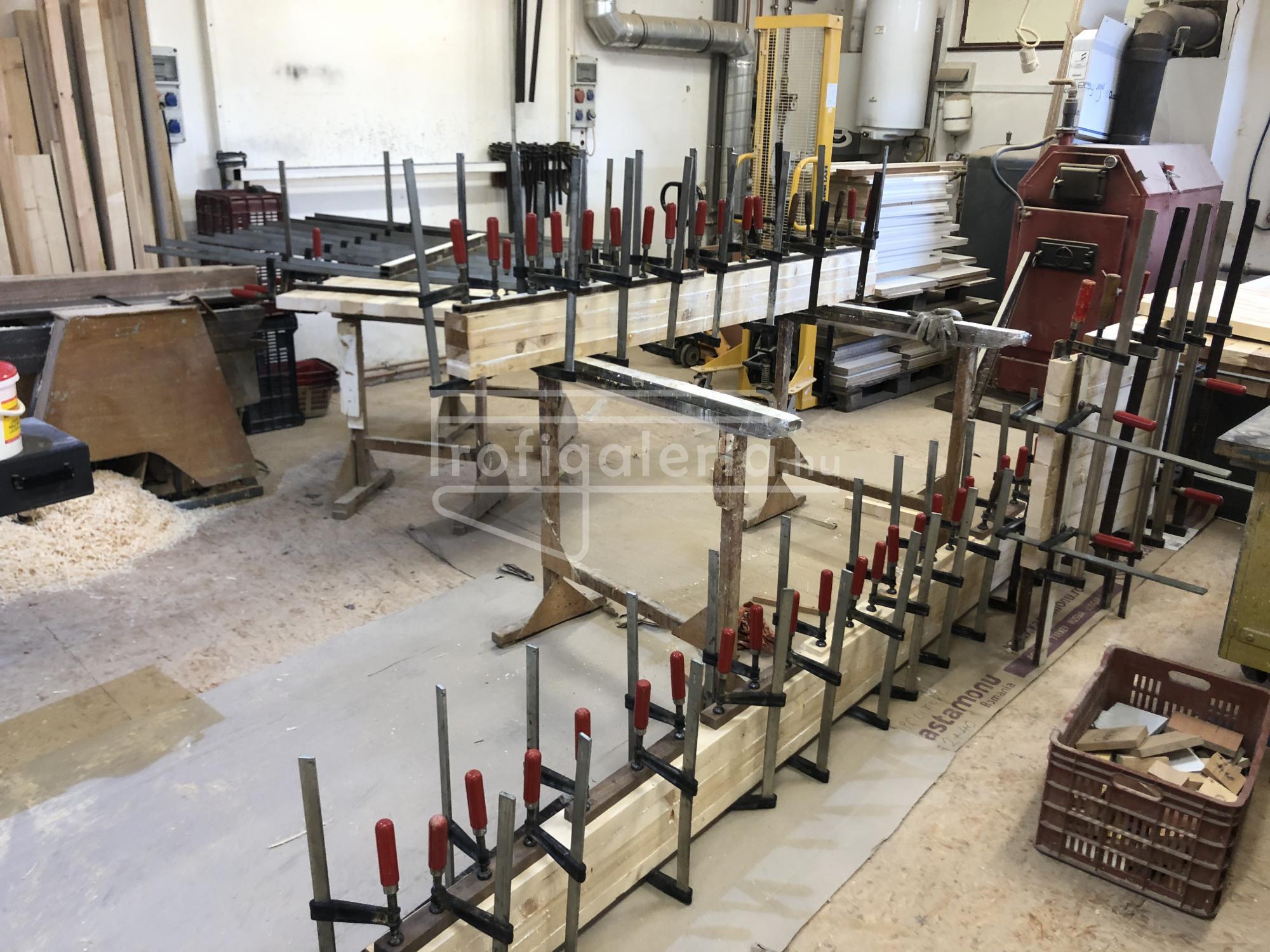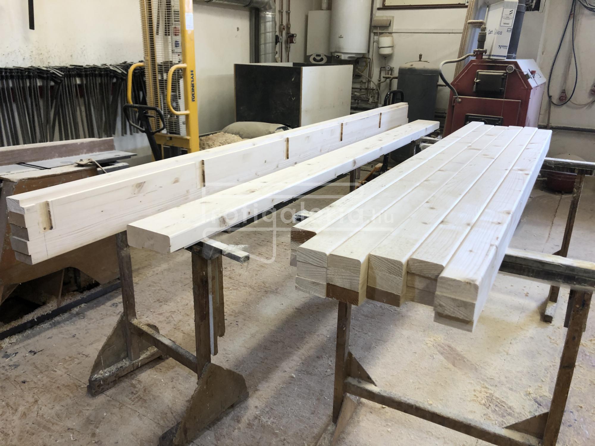 A galériákat saját magam készítem elő kiszállítás előtt. A fa sokkal stabilabb, ha több darabból van összeragasztva, ezért a legtöbb esetben ragasztott mestergerendát alkalmazok. Fesztávtól függően a kereszt gerendák is lehetnek ragasztottak. Ezeket a gerendákat vagy én ragasztom meg, vagy eleve ragasztott gerenda alapanyagból dolgozom. Akármelyik verzió mellett döntök, itt is a precizitást tartom az elsődleges szempontnak, ezért évekre előre fel van töltve a raktáram ragasztott és nem ragasztott áruval annak érdekében, hogy ne friss, hanem garantáltan száraz anyagból dolgozhassak. A ragasztásra váró fenyőáru felhasználás előtt 2-3 évet tölt egy nyáron 50-60 C°-os padláson, hogy garantáltan elveszítse a felhasználásig a faanyag a nem kívánt nedvességtartalmát, ezzel minimálisra csökkentem a vetemedés és a repedezés esélyét.