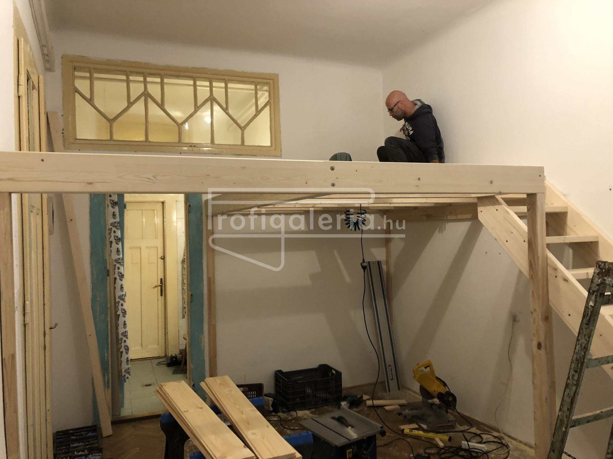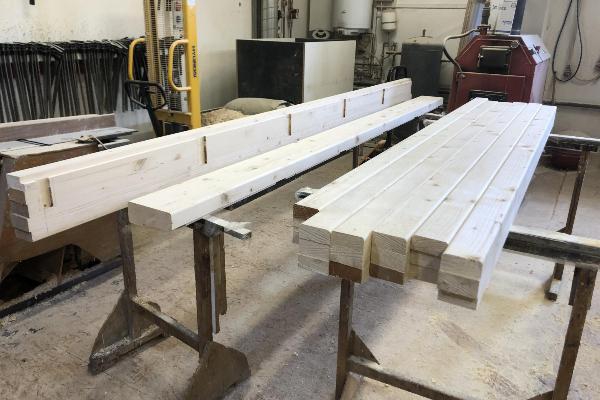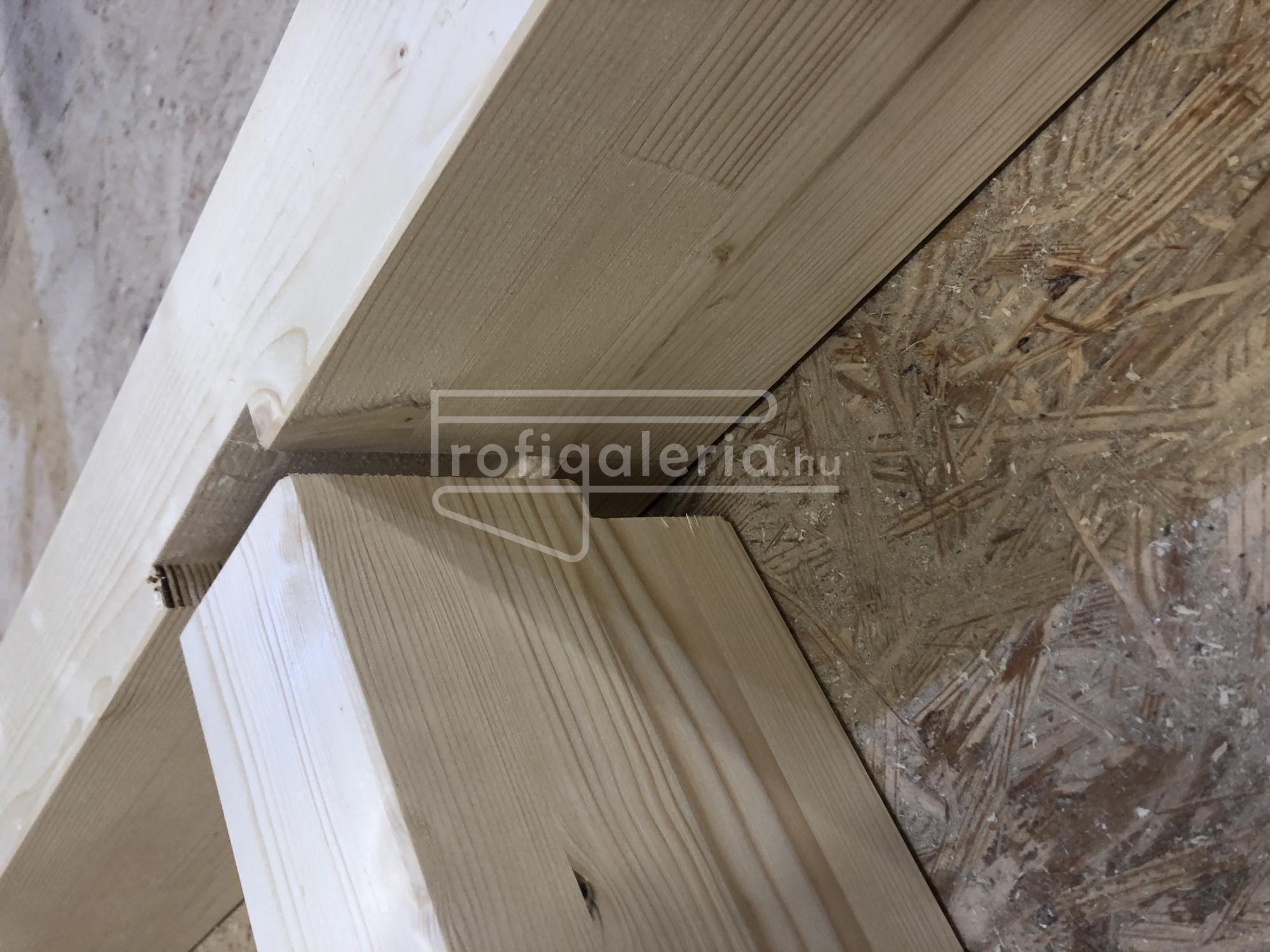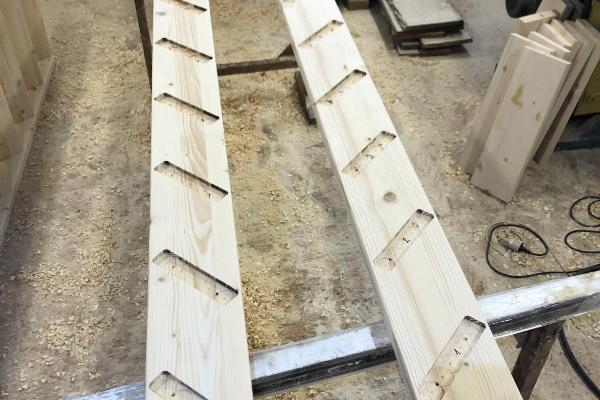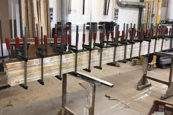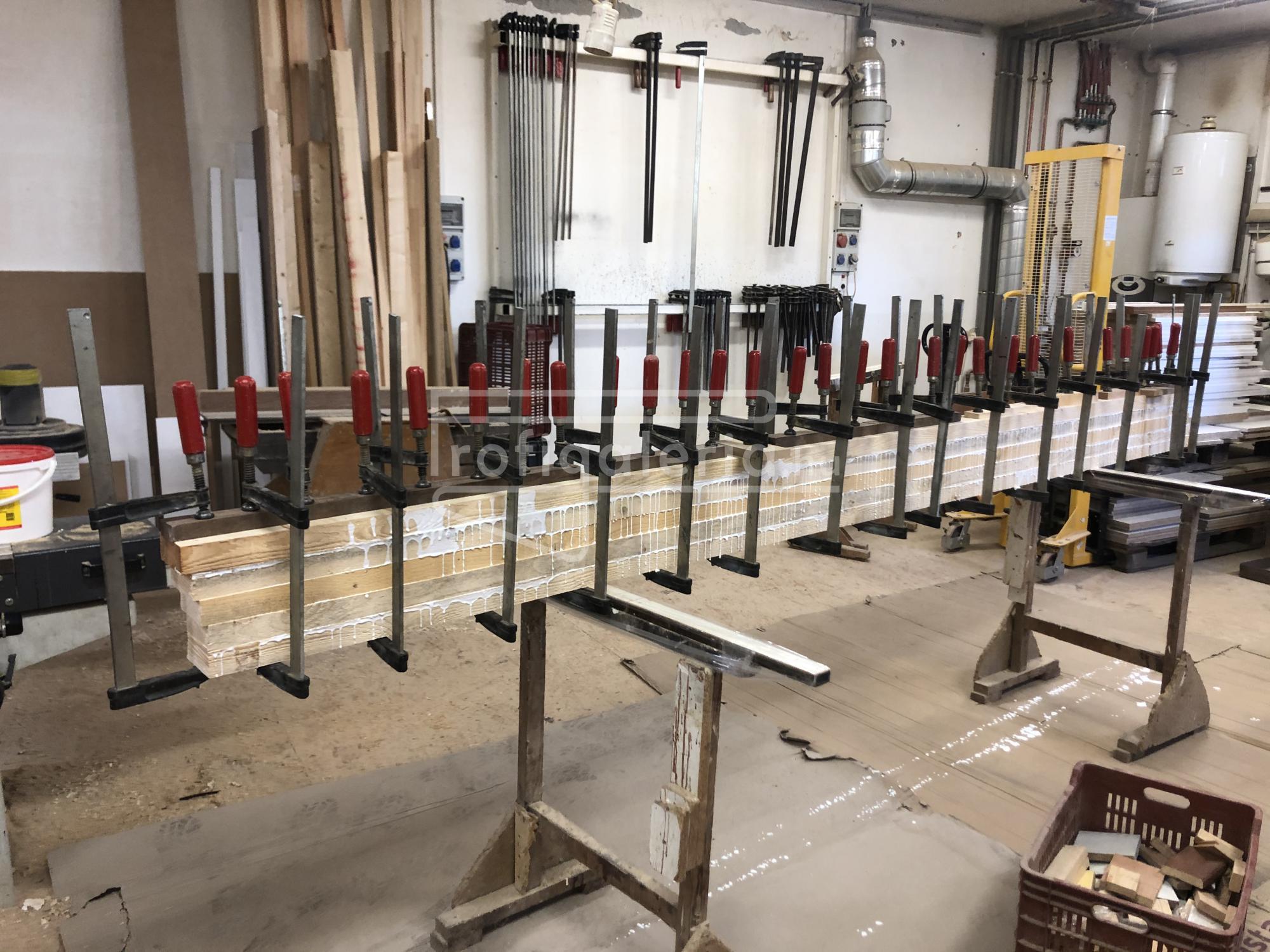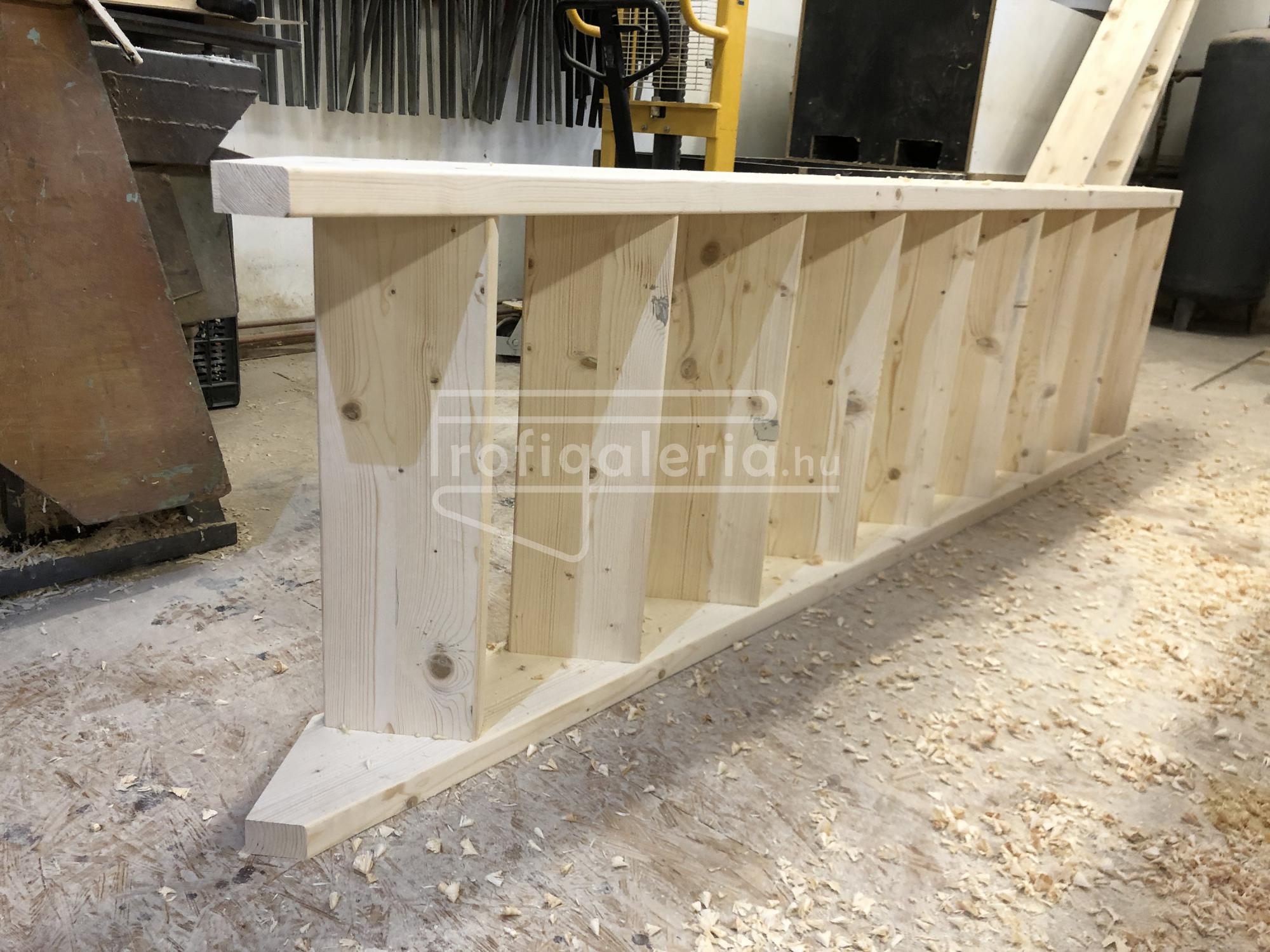 A galériákat saját magam készítem elő kiszállítás előtt. A fa sokkal stabilabb, ha több darabból van összeragasztva, ezért a legtöbb esetben ragasztott mestergerendát alkalmazok. Fesztávtól függően a kereszt gerendák is lehetnek ragasztottak. Ezeket a gerendákat vagy én ragasztom meg, vagy eleve ragasztott gerenda alapanyagból dolgozom. Akármelyik verzió mellett döntök, itt is a precizitást tartom az elsődleges szempontnak, ezért évekre előre fel van töltve a raktáram ragasztott és nem ragasztott áruval annak érdekében, hogy ne friss, hanem garantáltan száraz anyagból dolgozhassak. A ragasztásra váró fenyőáru felhasználás előtt 2-3 évet tölt egy nyáron 50-60 C°-os padláson, hogy garantáltan elveszítse a felhasználásig a faanyag a nem kívánt nedvességtartalmát, ezzel minimálisra csökkentem a vetemedés és a repedezés esélyét.