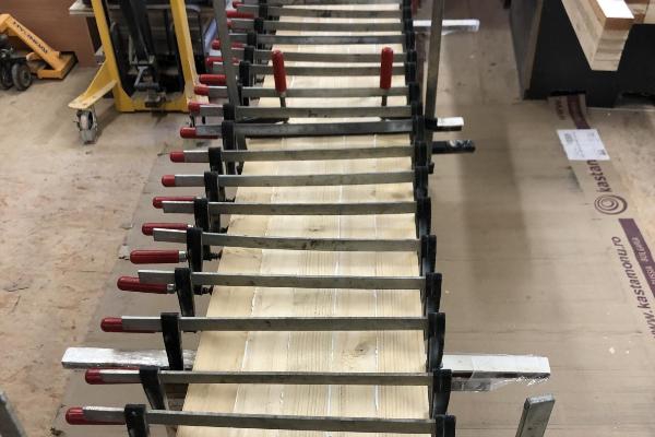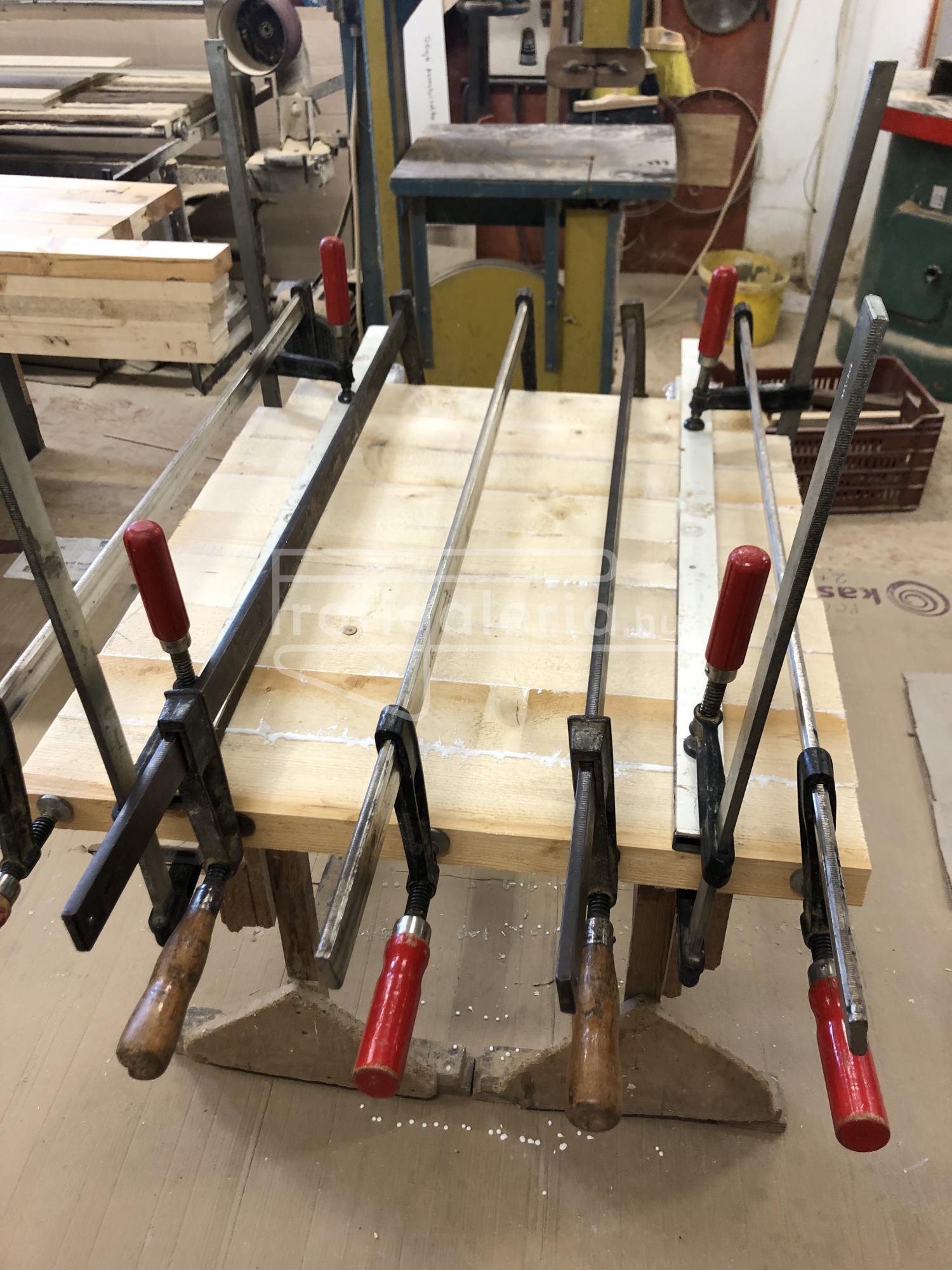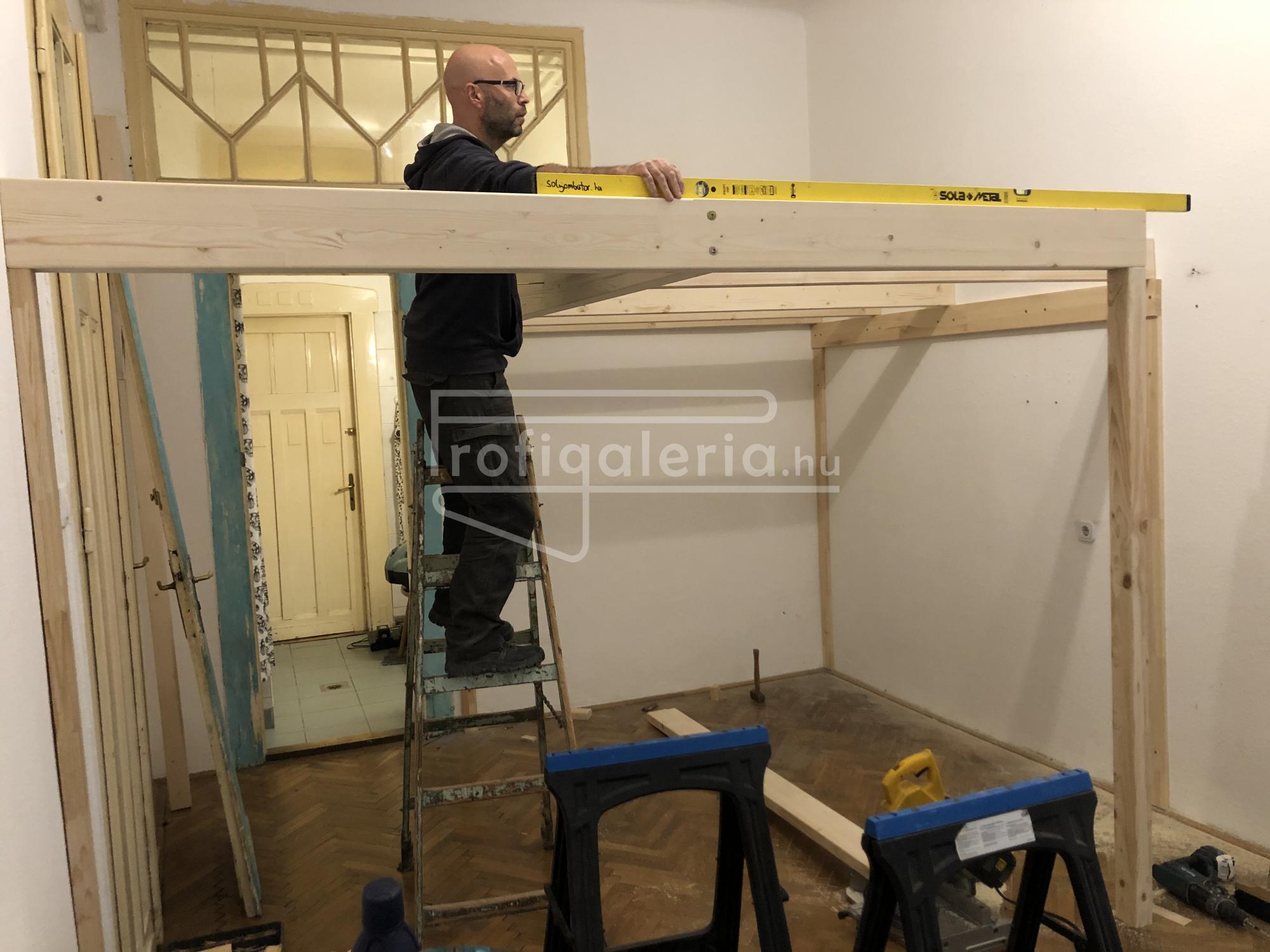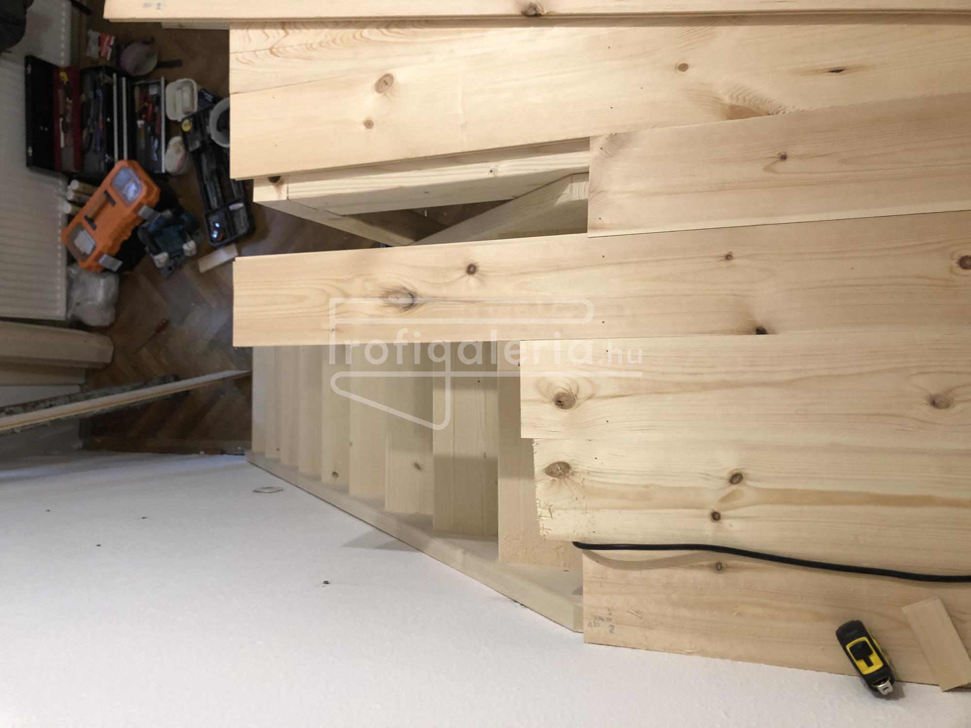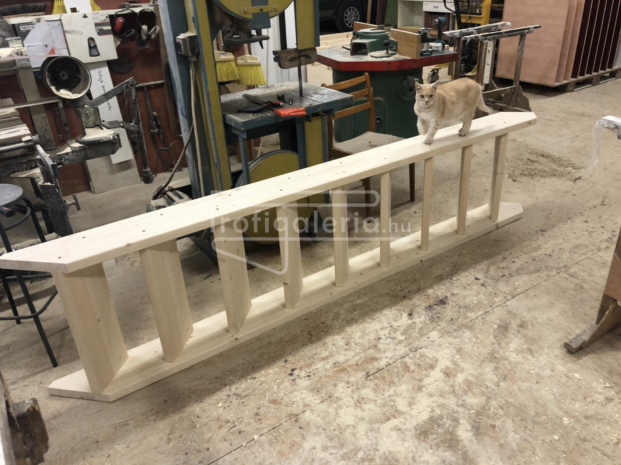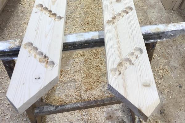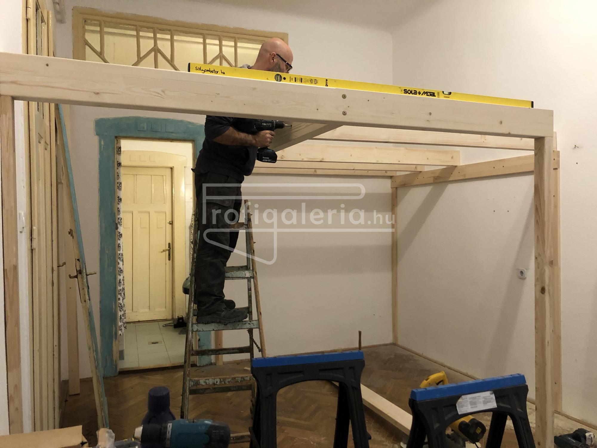 A galériákat saját magam készítem elő kiszállítás előtt. A fa sokkal stabilabb, ha több darabból van összeragasztva, ezért a legtöbb esetben ragasztott mestergerendát alkalmazok. Fesztávtól függően a kereszt gerendák is lehetnek ragasztottak. Ezeket a gerendákat vagy én ragasztom meg, vagy eleve ragasztott gerenda alapanyagból dolgozom. Akármelyik verzió mellett döntök, itt is a precizitást tartom az elsődleges szempontnak, ezért évekre előre fel van töltve a raktáram ragasztott és nem ragasztott áruval annak érdekében, hogy ne friss, hanem garantáltan száraz anyagból dolgozhassak. A ragasztásra váró fenyőáru felhasználás előtt 2-3 évet tölt egy nyáron 50-60 C°-os padláson, hogy garantáltan elveszítse a felhasználásig a faanyag a nem kívánt nedvességtartalmát, ezzel minimálisra csökkentem a vetemedés és a repedezés esélyét.